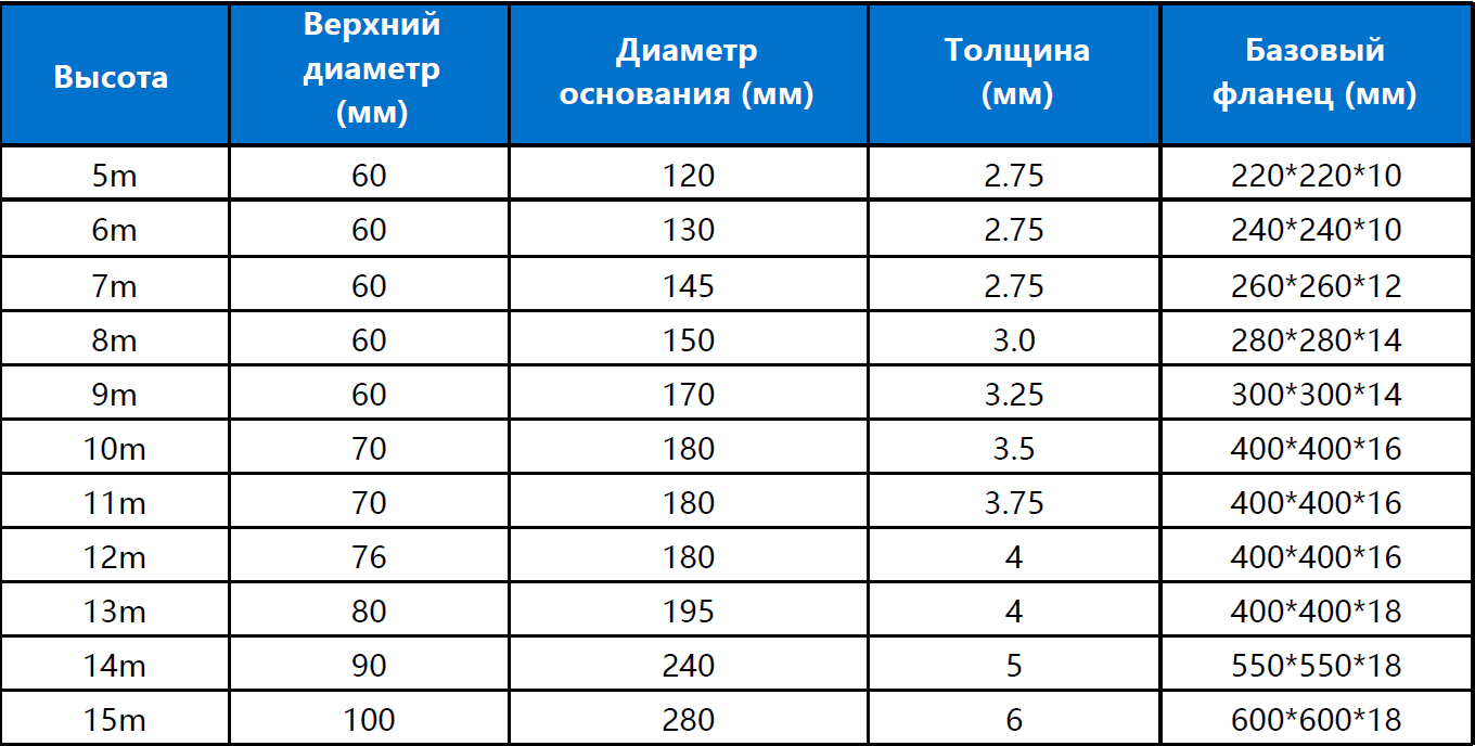 Оптимизированная с помощью компьютера конусообразная конструкция. Автоматическая сварка под флюсом. Скорость ветра: ≥150 км/ч (41,5 м/с). Возможен индивидуальный расчет ветровой нагрузки.